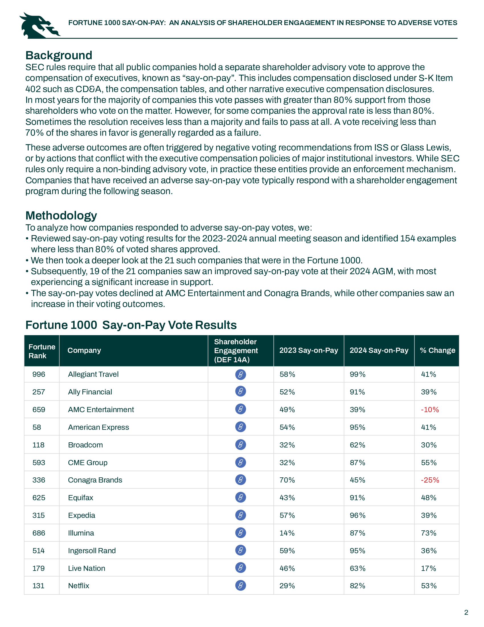 DragonGC analyzed Fortune 1000 companies that received adverse Say-on-Pay votes to assess how they responded through shareholder engagement programs. We evaluated these programs and examined the subsequent year’s voting results to measure their impact.